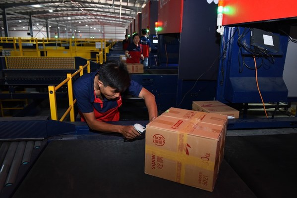 在百世越南胡志明市的转运中心,工作人员正在扫描一箱从中国寄来的纸巾