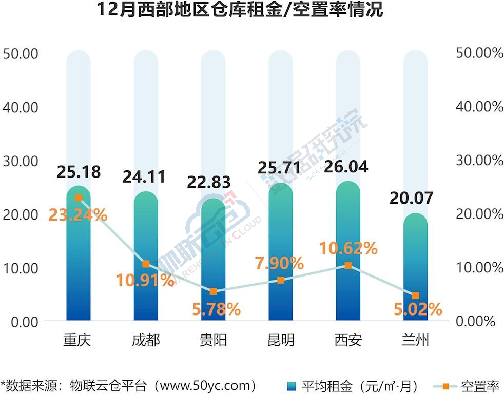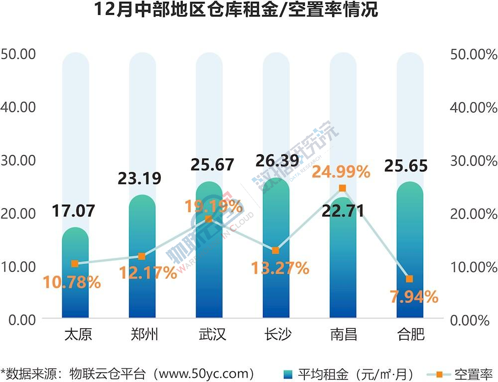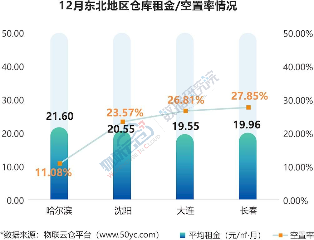 全国32个城市仓库平均空置率为12.13%,与上月持平。其中,东北地区空置率(22.33%)远高于中部(14.72%)、西部(10.58%)、东部(9.28%)。相较11月,东北、中部地区空置率有所上升,升幅分别为3.69和1.20个百分点;西部地区空置率有所下降,降幅为1.87个百分点;东部地区空置率均相对稳定,升(降)幅变化在±1个百分点以内。