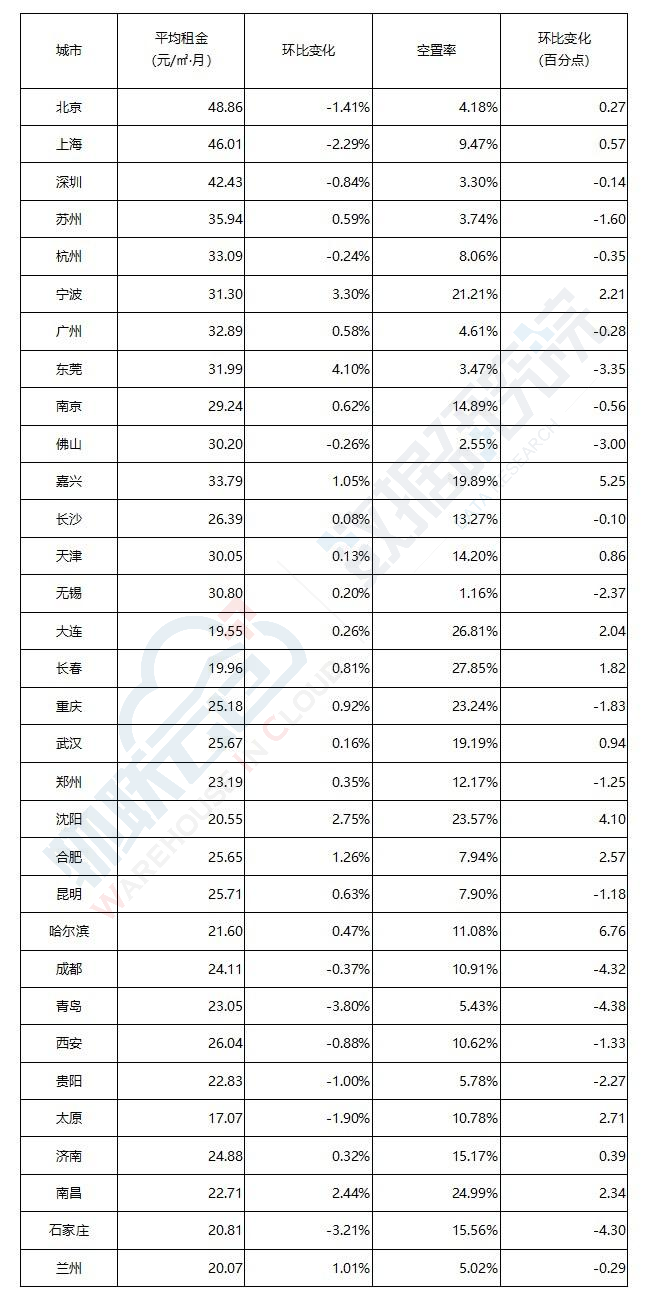 表:全国32个城市平均租金和空置率一览表
